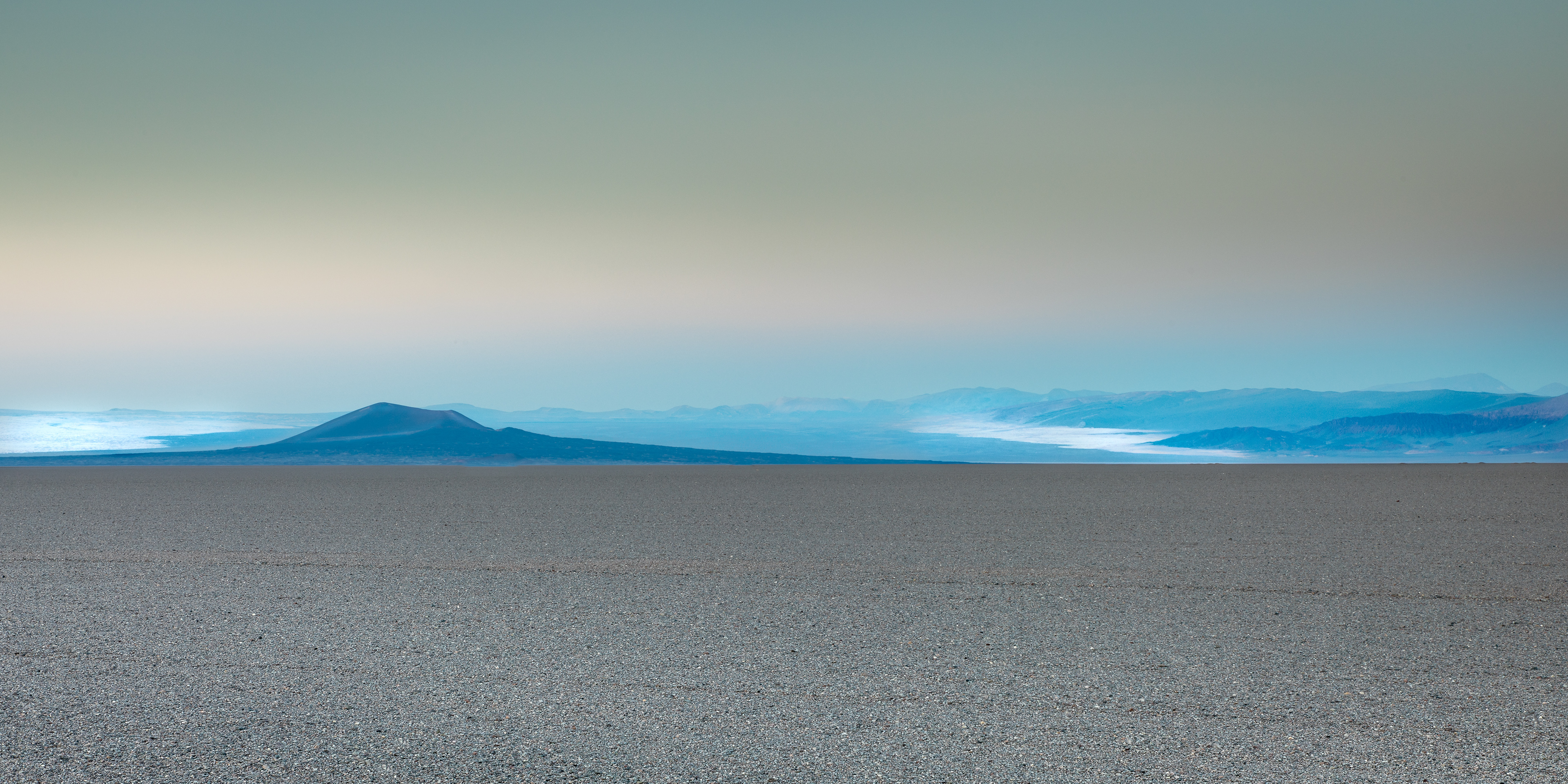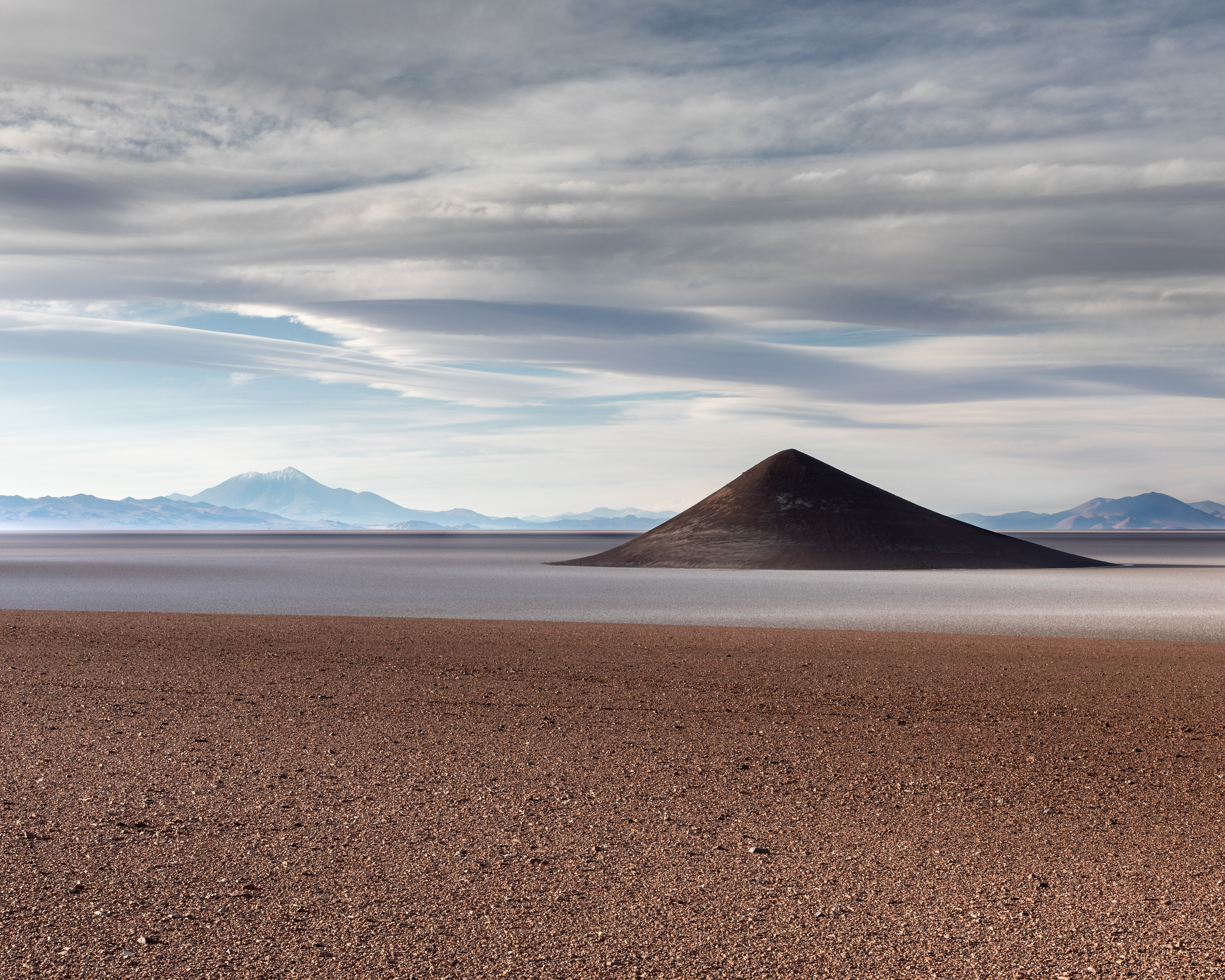 This black volcano is actually one of hundreds in the Atacama. This image was captured perhaps 30 miles away across a flat plain of gravel. You can see salt flats on either side of the volcano. That's not water!!
