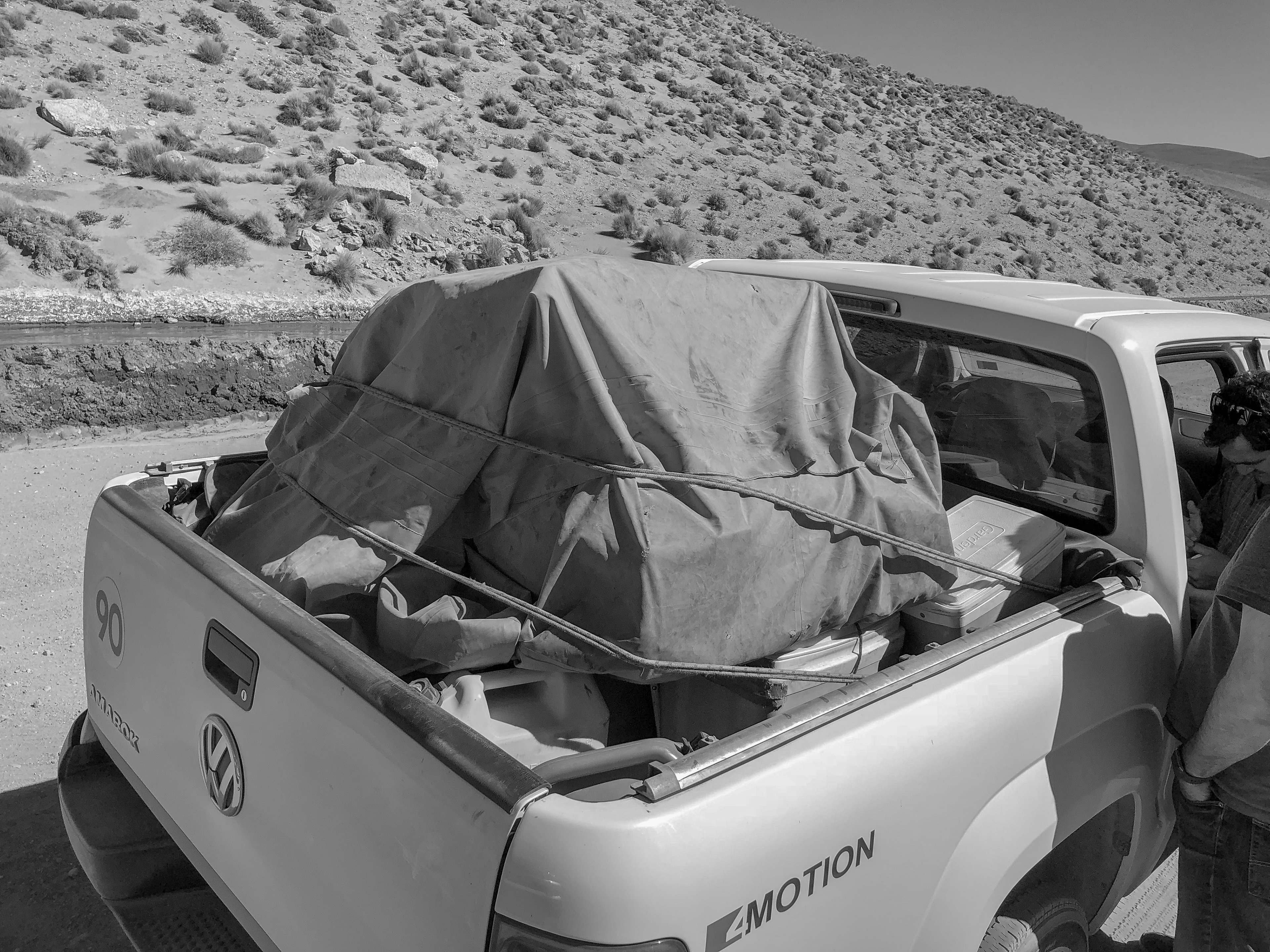 Dirt and dust is everywhere. It gets into everything! Gear to be kept somewhat clean was wrapped in canvas. Notice the jerry cans of fuel also in the truck.