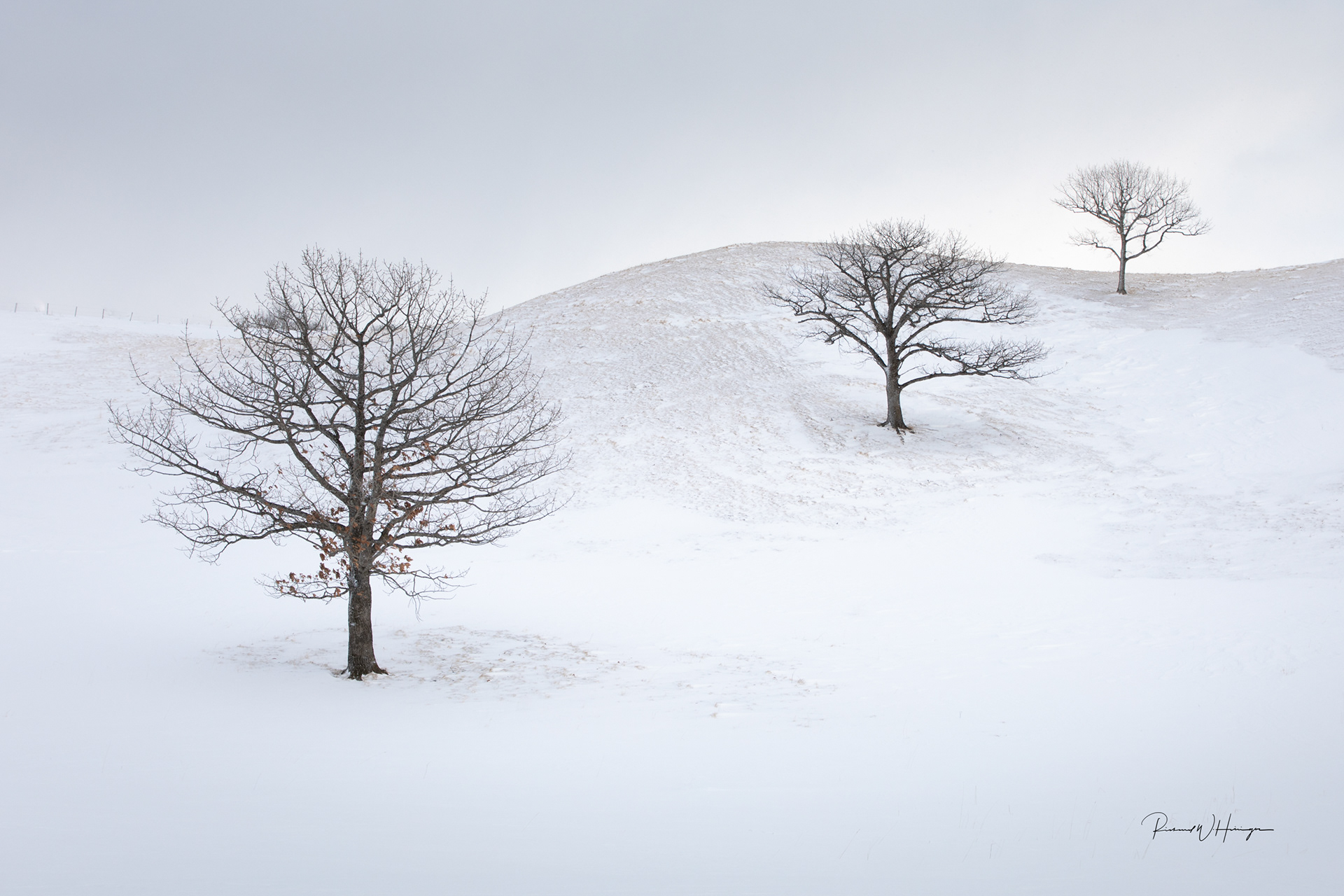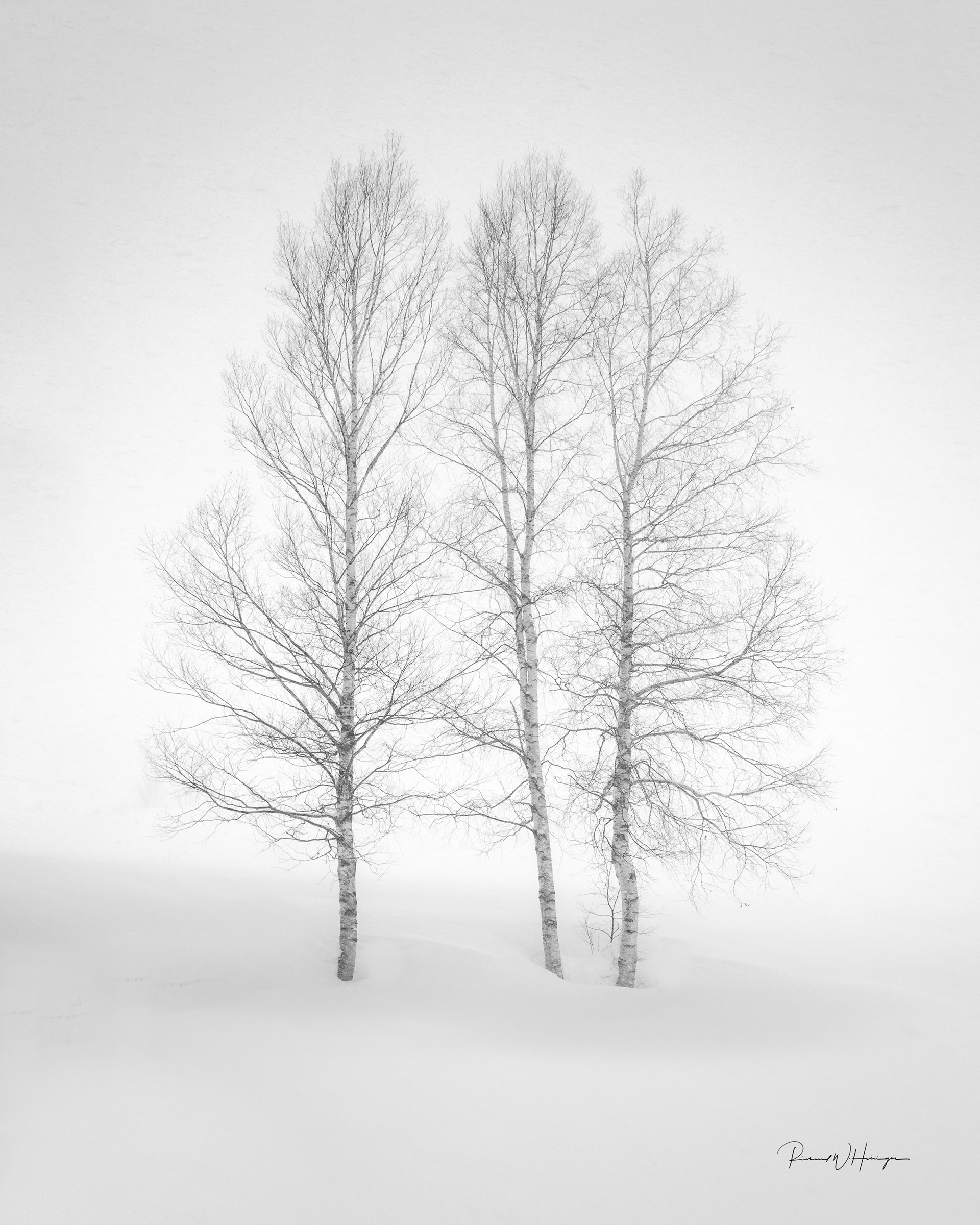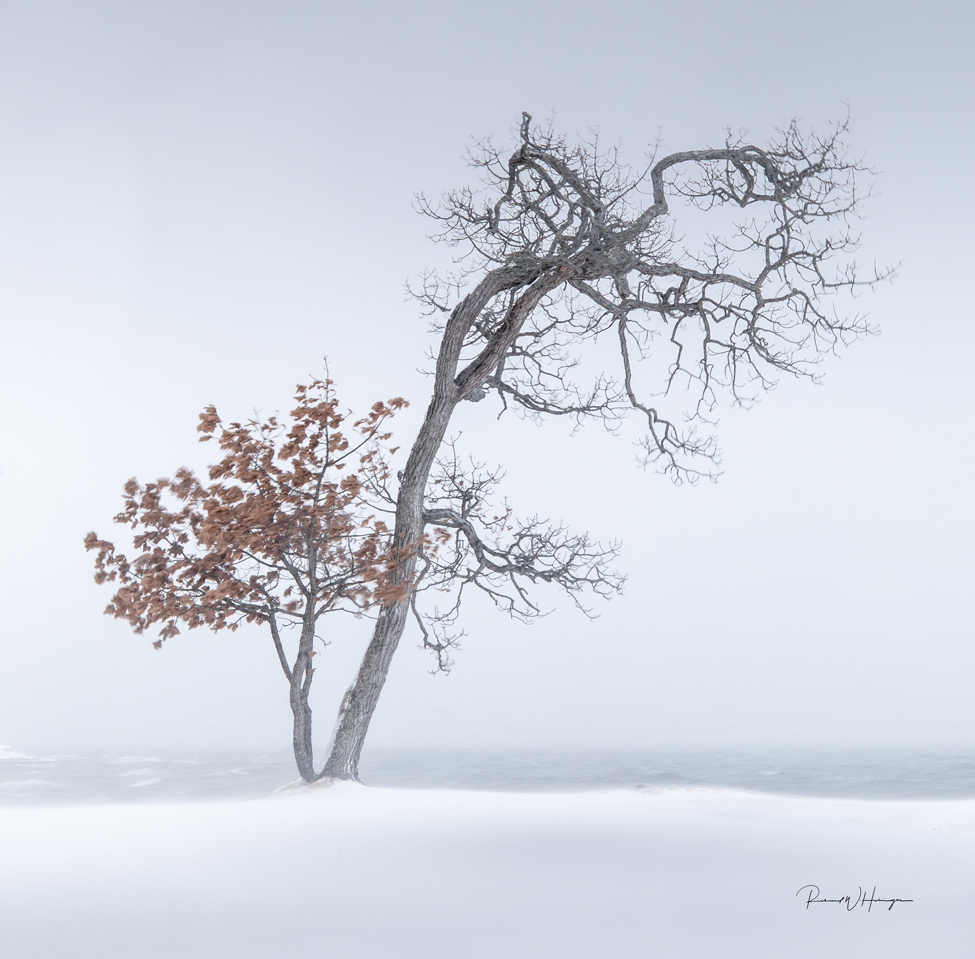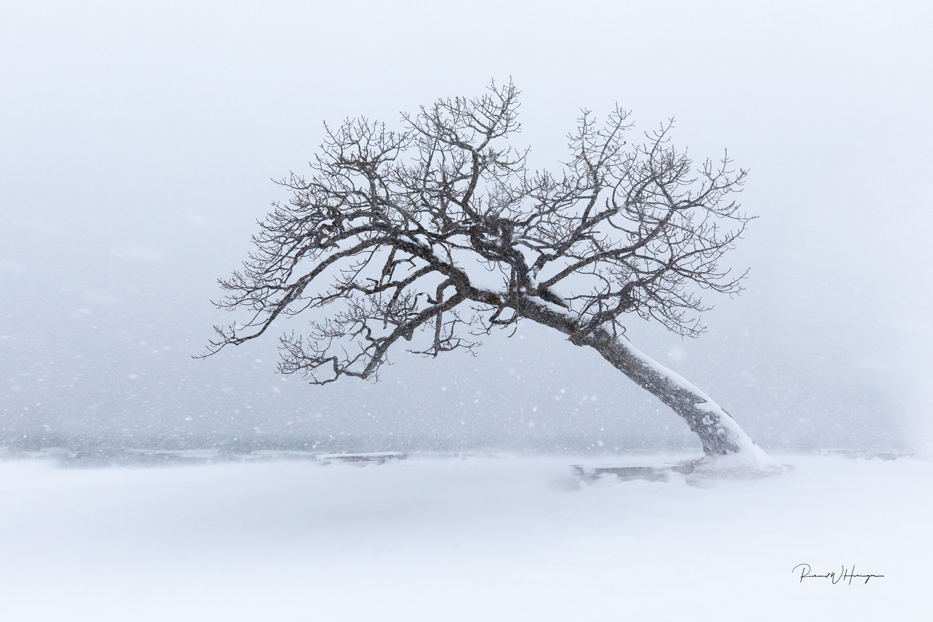 This beautiful image was again captured in high wind and driving snow. In this case, the trees are actually leaning into the wind. I believe normally the wind would be coming from the opposite direction. I intentionally used a slightly longer shutter speed in order to create a streaking effect by the blowing snow.