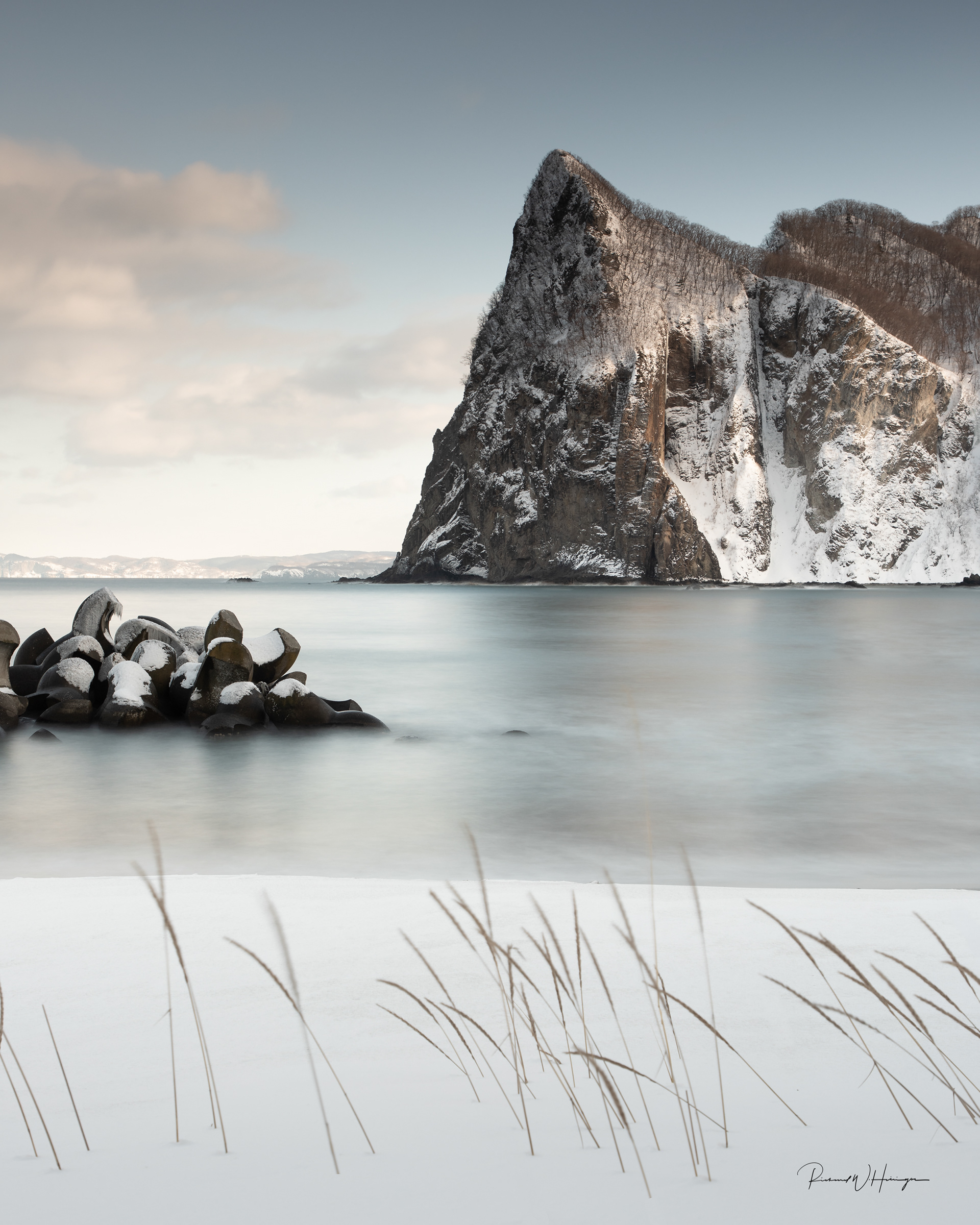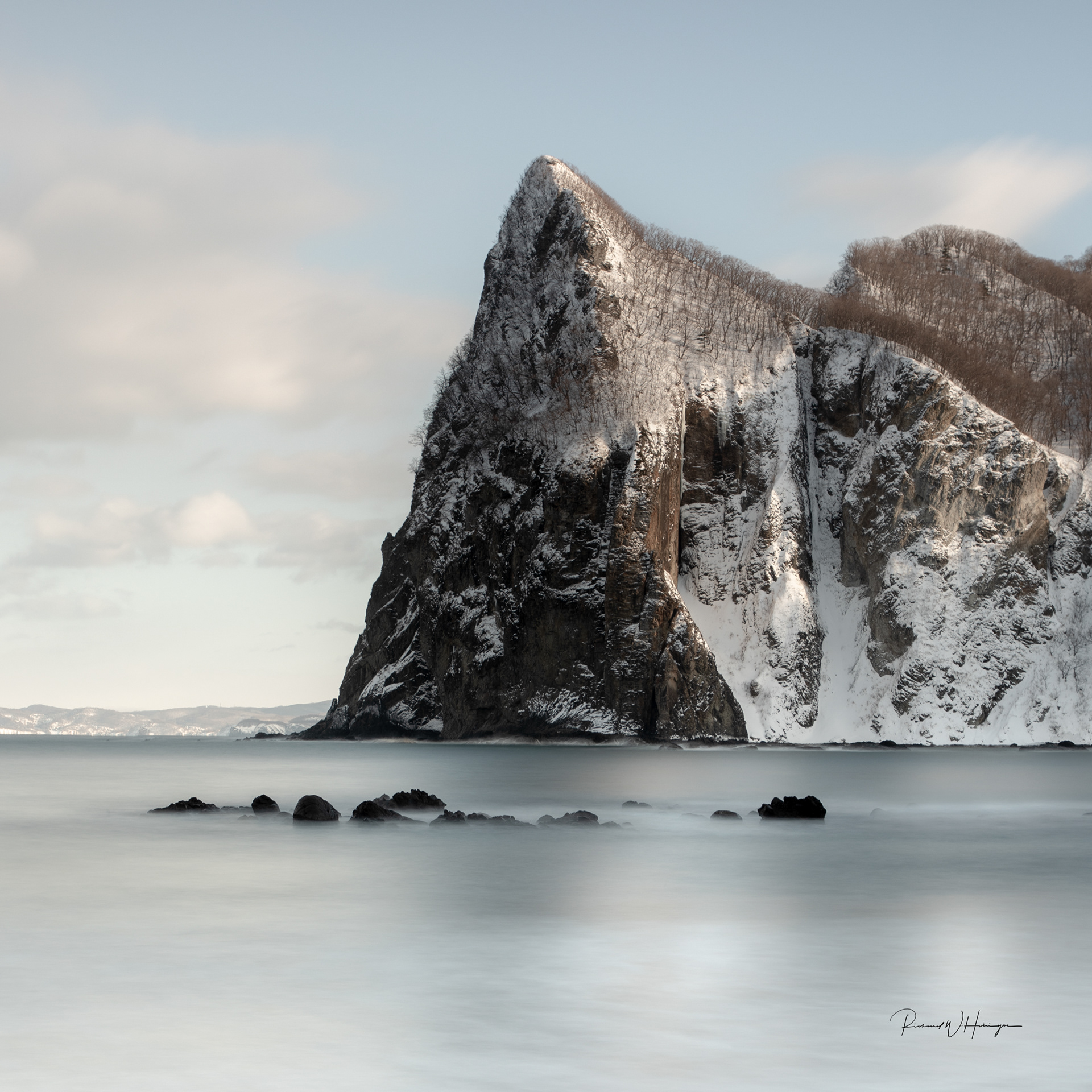 Cape Eboshi is located on the northwest coastline of Hokkaido facing the Sea of Japan, not far from the city of Sapporo. This natural promontory was shaped by thousands of years of uneven coastal erosion. At some point the front face collapsed into the sea revealing a near perfect isosceles triangle. The triangle goes nearly unnoticed unless the light is just right, together with the snow clinging to more gradual surfaces.
