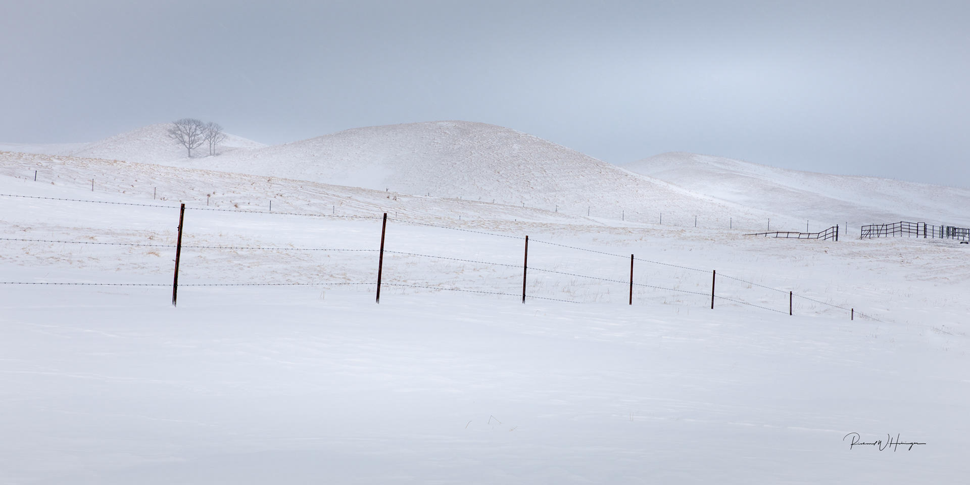 This was taken with peaceful, but heavy snowfall. The morning sun was attempting to fight its way into the scene. While visibility was obviously reduced to a few yards, it wasn't too cold and a pleasure to experience. In summertime, this same place is gorgeous in a different way with patchwork fields and rows of colorful flowers. The 16 trees planted in a row adorn the separation between two cultivated field areas. Here the soil is resting under the snow getting ready for the next season as it always has.
