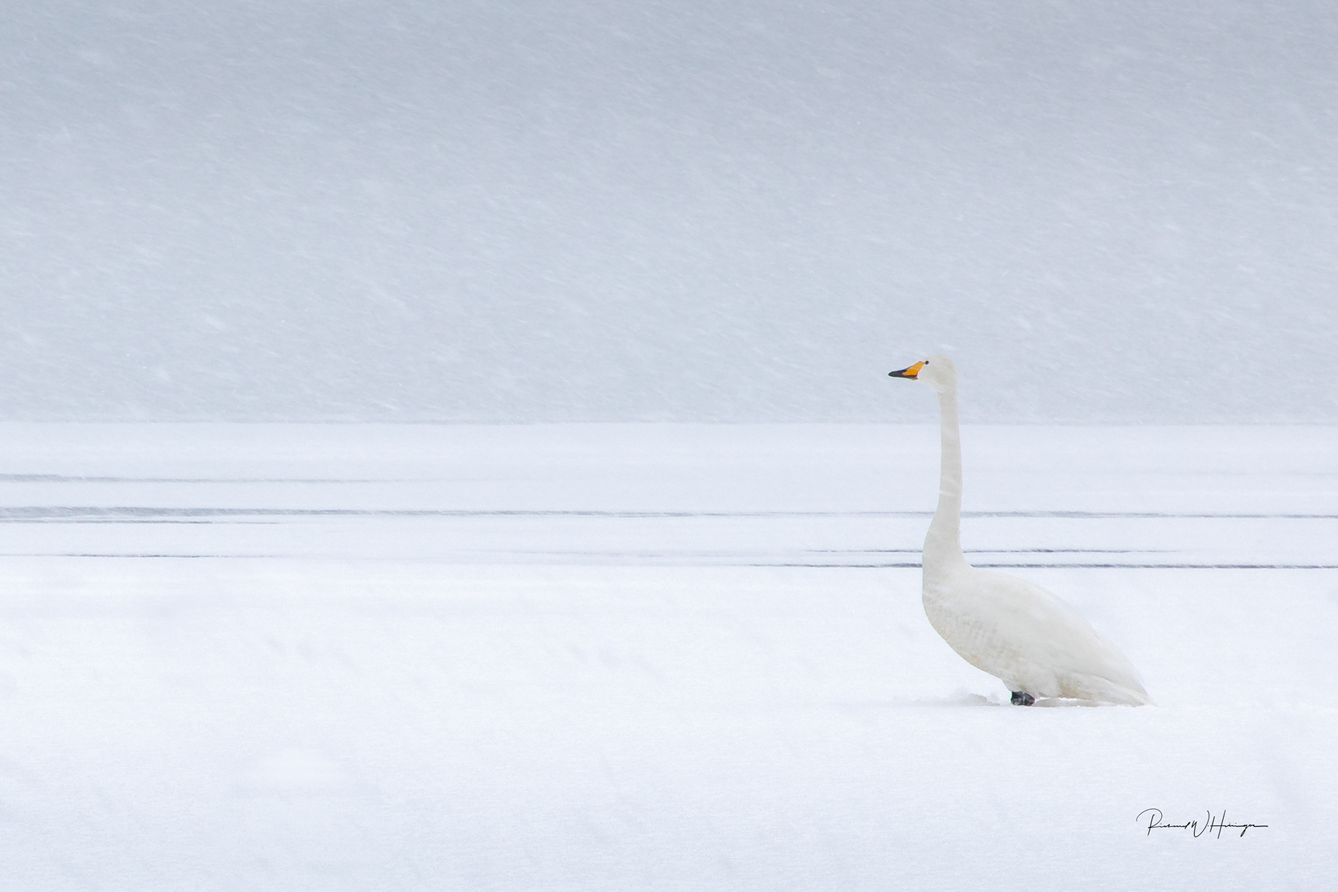 This was taken on a frozen lake during heavy snowfall. This beautiful swan was one of several in a group, none of which seemed to be bothered at all by the cold temperatures and freezing precipitation! It was strange to see such beautiful birds so completely at home in this environment.