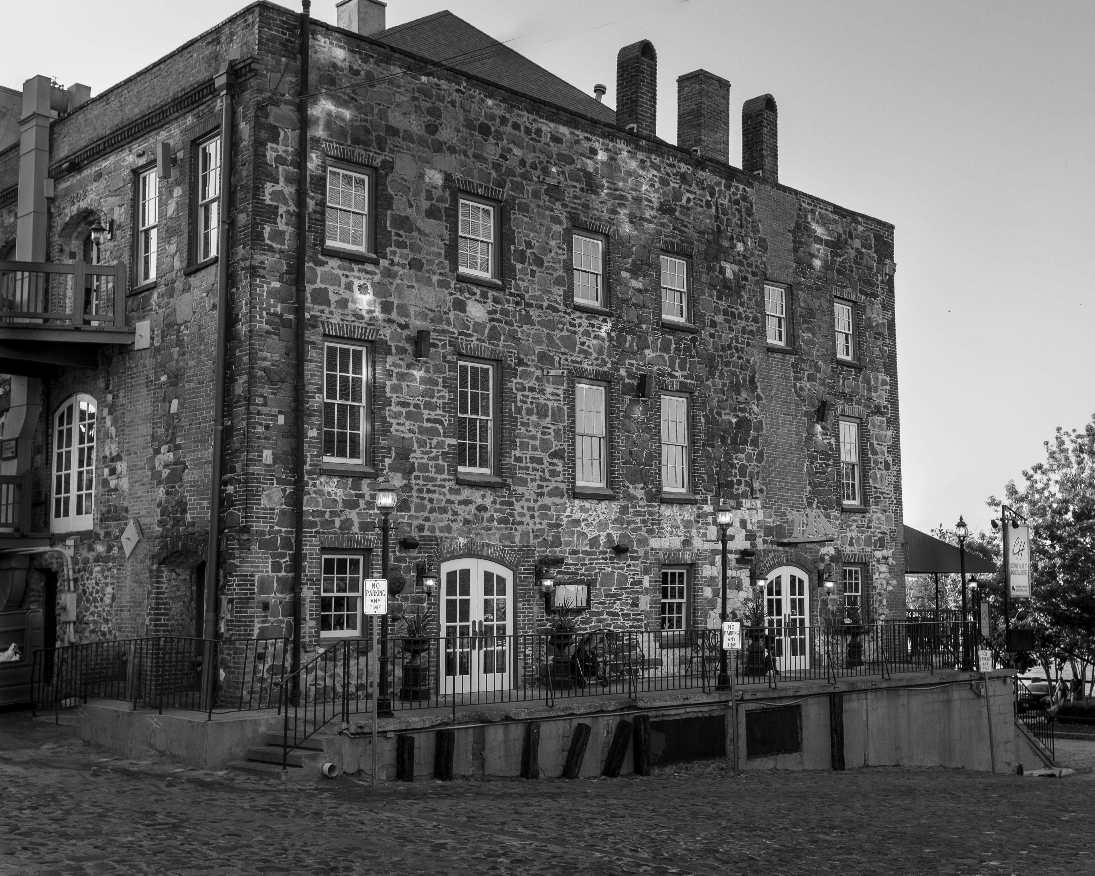 This is the oldest building in the original warehouse district. It's so old, it was built with random stones that were originally used ballast in ship holds. Ships arriving from Britain would unload these rocks before loading cotton, rice and other goods being shipped on the return trip. Ballast stones were also used to pave the early streets, etc. Today this building houses "Chart House" a popular restaurant.