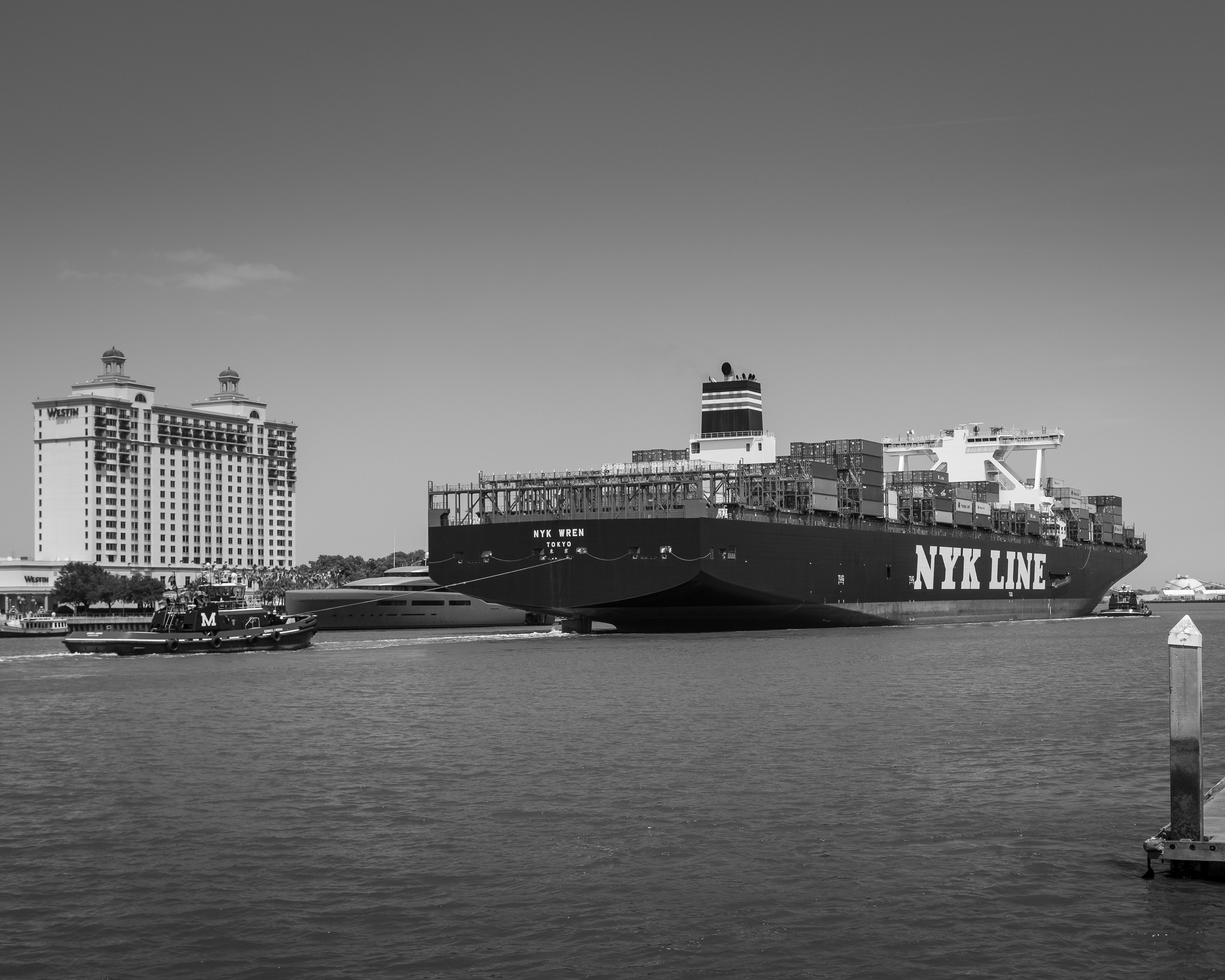 Most people don't know (I sure didn't) that Savannah is the nations third largest seaport behind Los Angeles and Long Beach. The NYK Wren arrived and departed while we were there. This vessel is unique due to its size. It is one of the few brand new "Panamax" class freighters. The Panamax class is the maximum size that can pass the recently enlarged Panama Canal. It is 1200 feet long, 160 feet wide and 50 feet below the water line. The Savannah river is continuously dredged to accommodate the deep draft plus they can only arrive and depart at high tide.