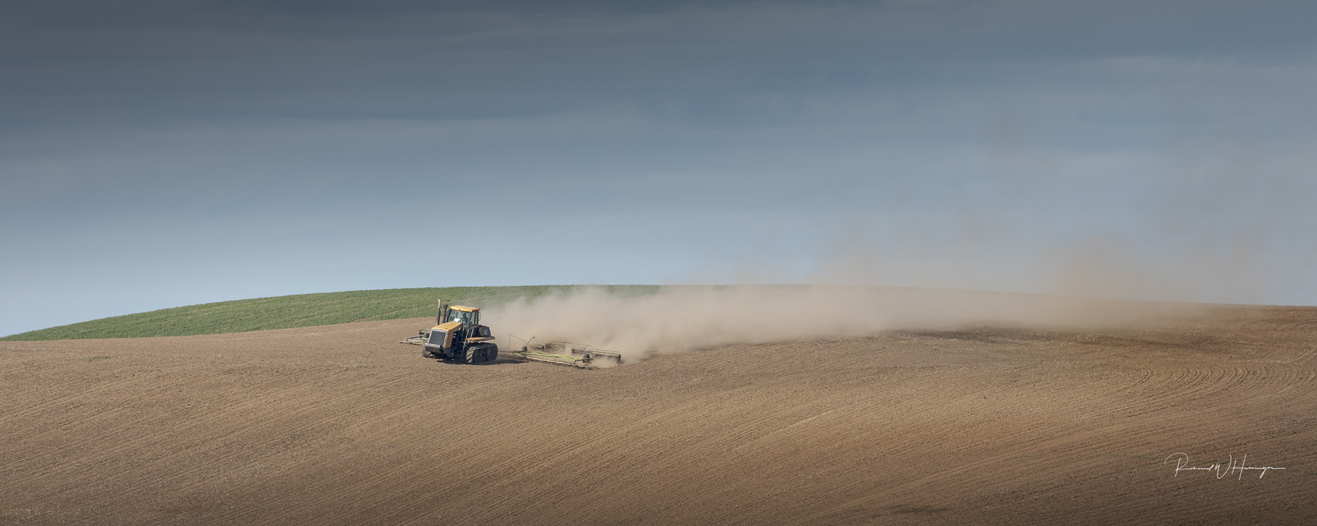 Another Wide Panorama! Beautiful. This land is being prepared for the planter being careful to preserve the subsoil moisture and as much residue as possible on top to protect the soil from erosion until the new crop emerges. The purpose of this step is to remove any remaining weeds and to optimize the seedbed. Notice the tractor has tracks instead of wheels which reduce the pressure on the soil so it isn't compacted. And, of course, automatic steering system for perfect pass to pass spacing to prevent wasteful overlap!