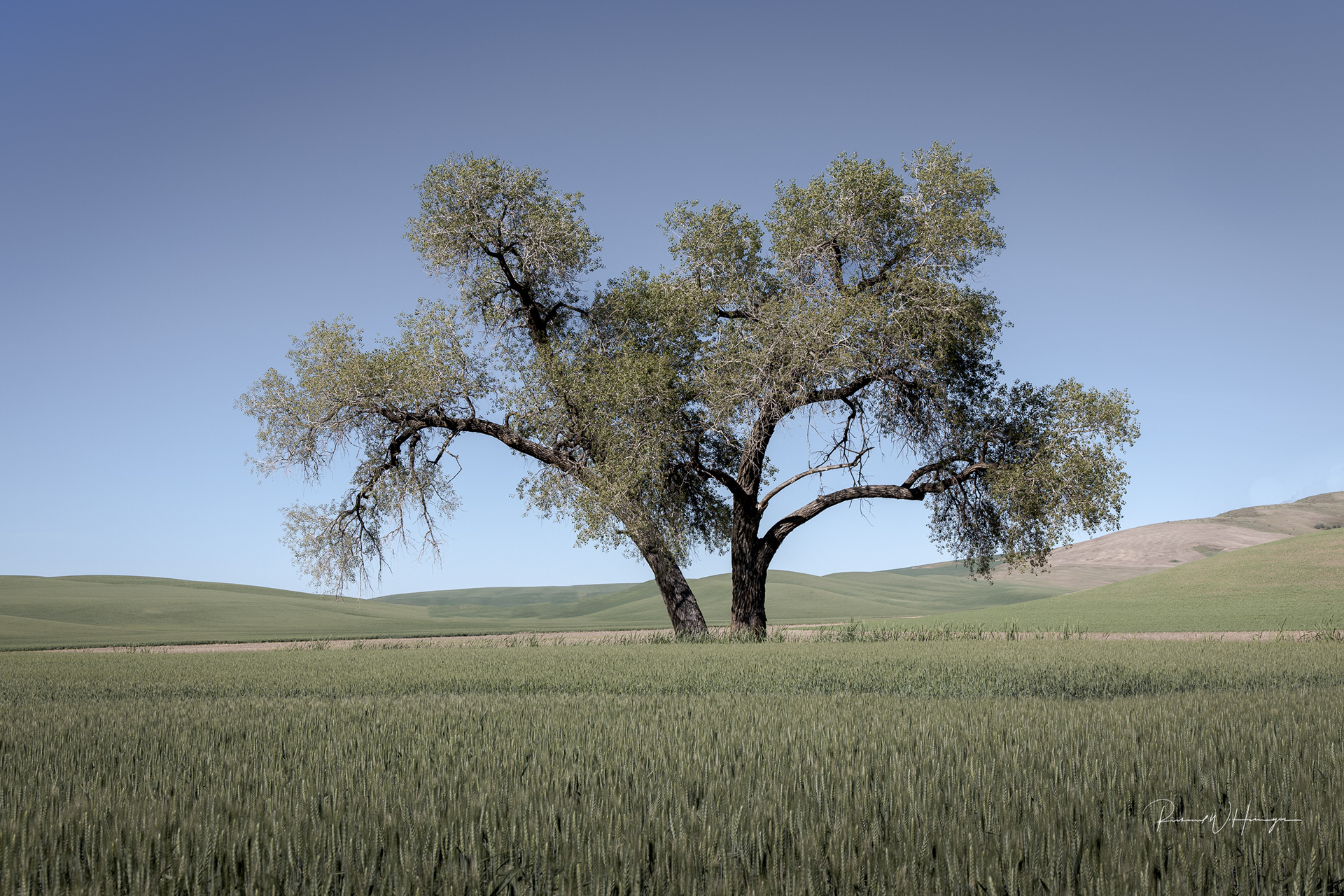 The Loess hills of the Palouse soak up water like a sponge in the winter. Crops root deep to utilize that moisture without the need for irrigation. One of the many brilliant aspects of Agriculture in the Palouse. That said, there are low spots where excess water is channeled making an oasis of sorts at the lowest points. These trees exist side by side sharing the water from one of those drainage areas.