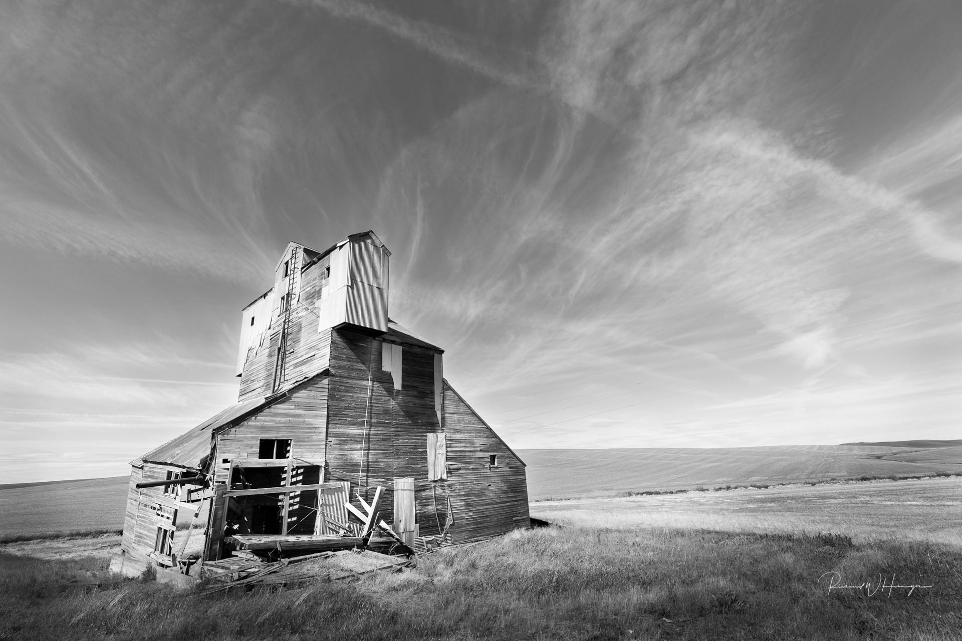 If only this abandoned elevator could tell its stories. I know one. The road sits to the left. A few years ago, a semi-truck driver went to sleep driving at night and ran off the road crashing right into the side, pushing the entire structure to the right. Unfortunately, it probably won't be long until it goes completely over, but at least for now it reminds us about the passage of time and the accumulation of battle scars. We all have them!