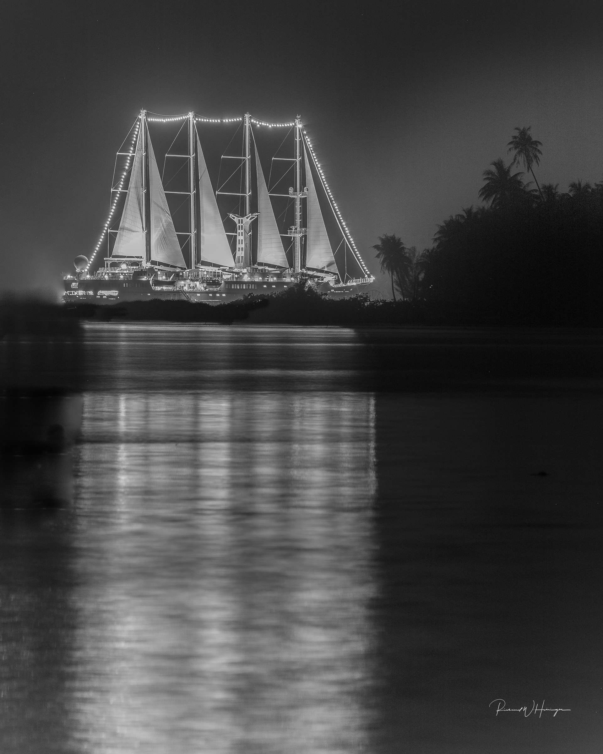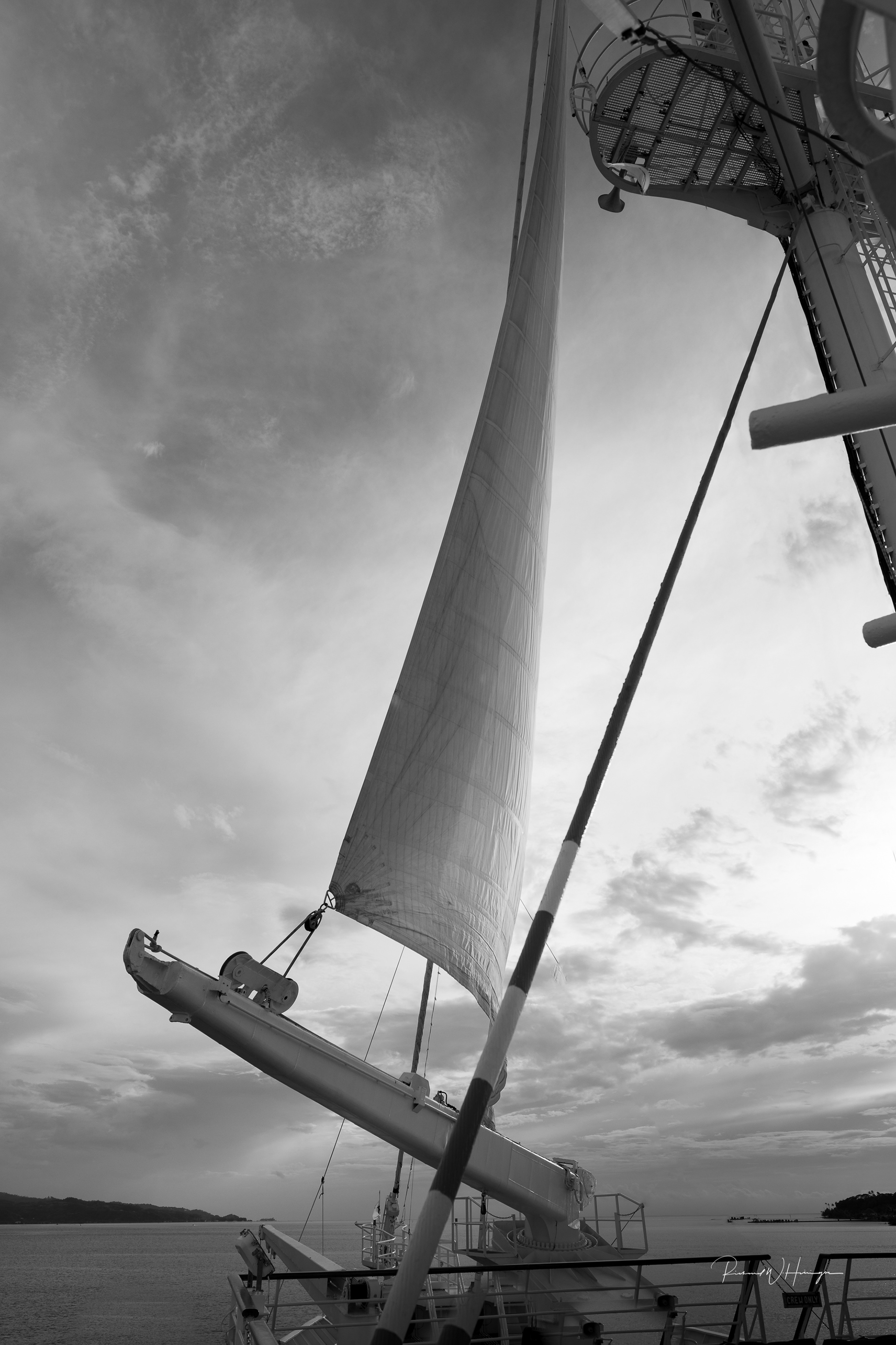 This was taken in the evening, midway between Raiatea and Bora Bora. I blended three photographs in order to capture the full height of the sails in such close quarters.